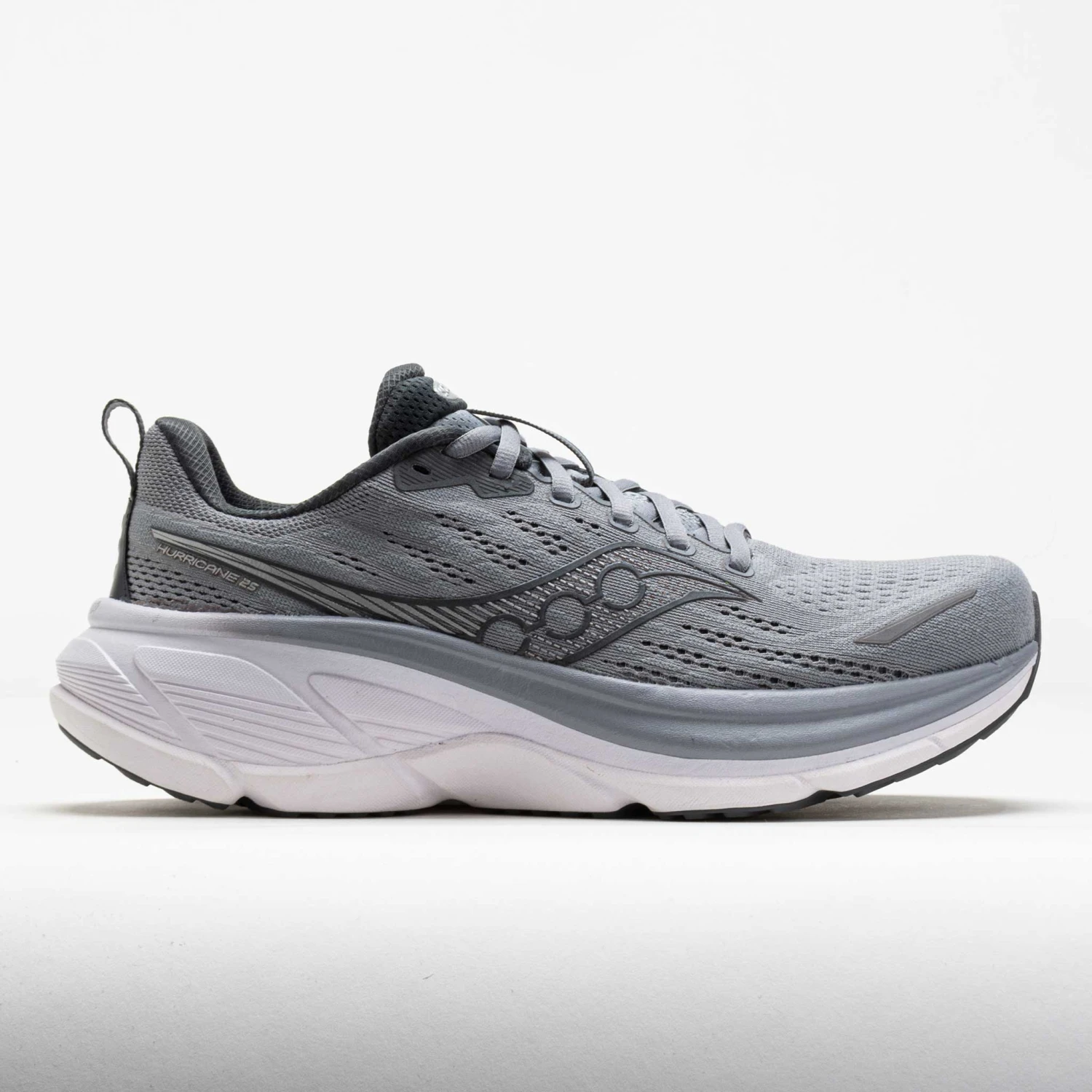 Enjoy foot-cradling comfort with every step in the Saucony Hurricane 25! This max-cushioned stability shoe returns with reliable protection, a stable platform and a dual-layer midsole. Get a double dose of comfort on the PWRRUN RB and PWRRUN midsole. Center Path technology features a broader platform and higher sidewalls to support your stride. Soft, stable and protective, the Saucony Hurricane 25 brings balance to your daily movement!